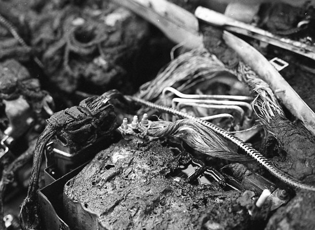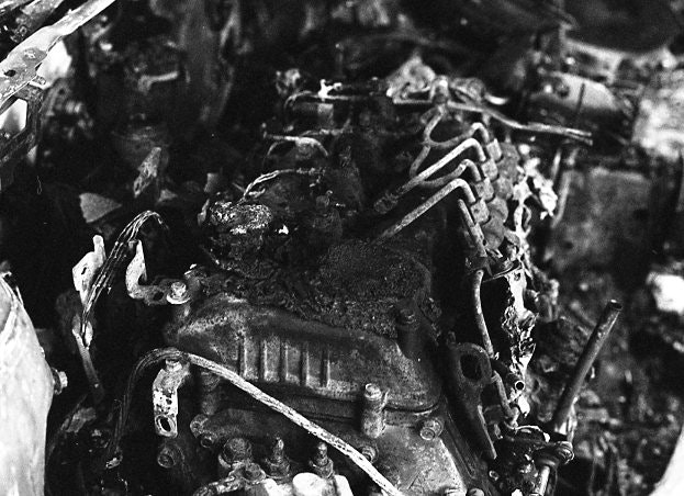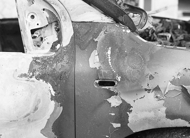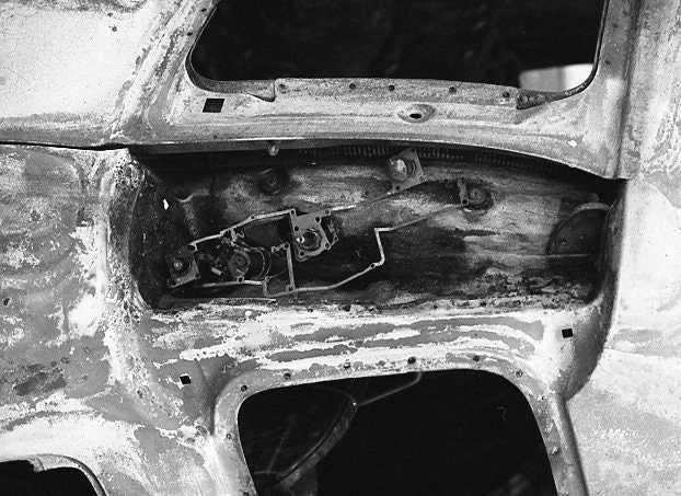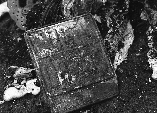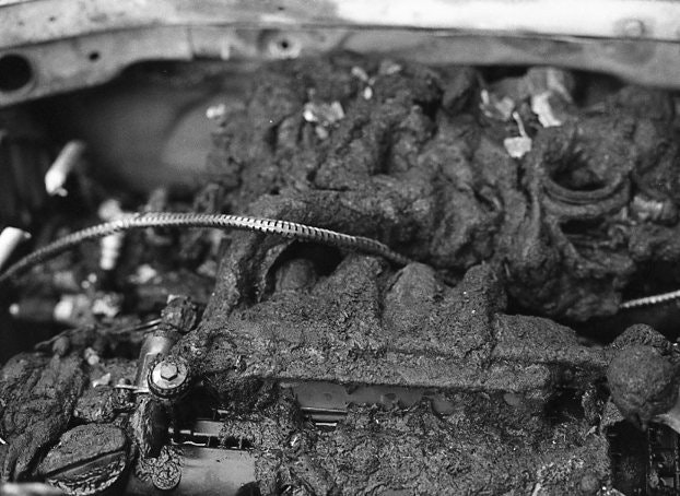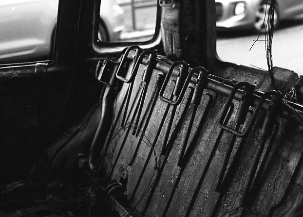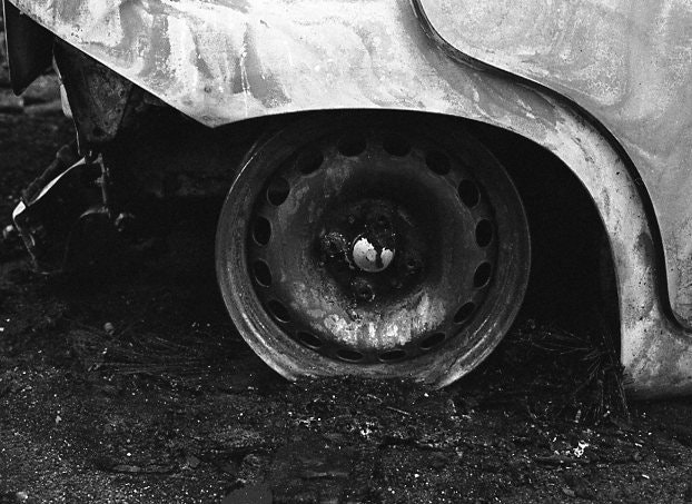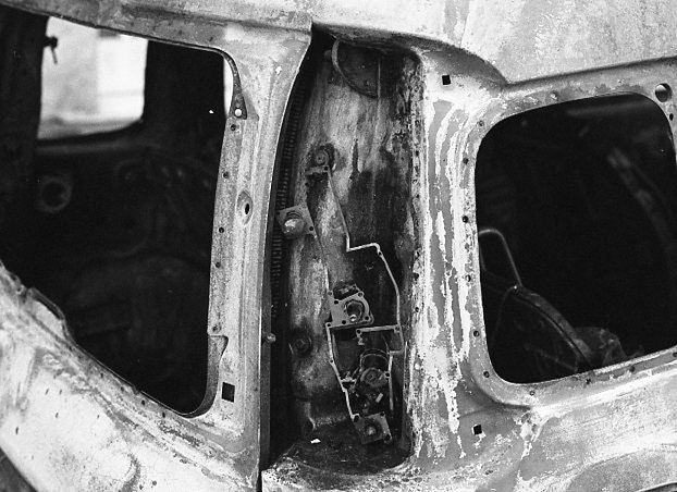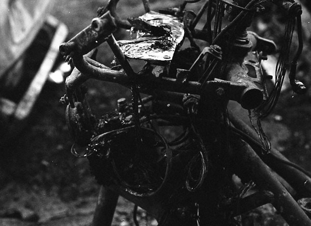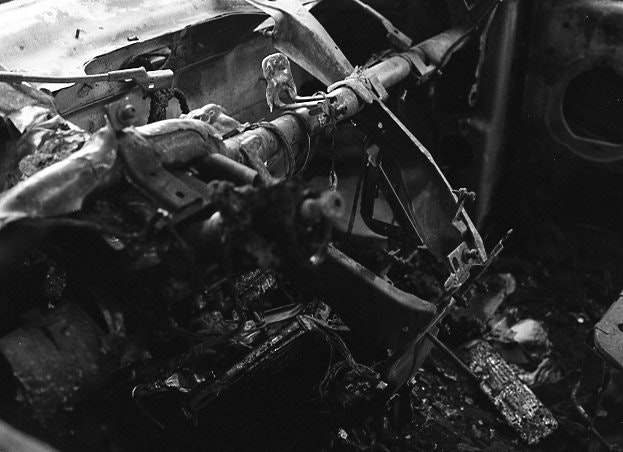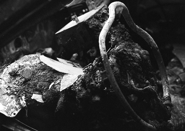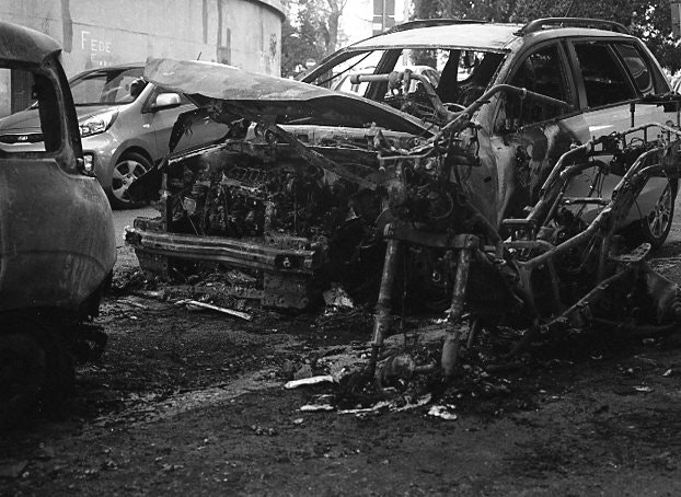 This is a series of black & white negatives shot on 120 HP5 film. The scene is the aftermath of an arson attack in 2020 on a couple of cars and a motor bike near Via Salaria in Rome. There is a melting away and stripping back of metals & plastics to reveal the skeletal essence of what remains.