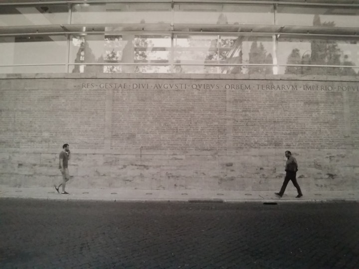 The rise of fascist totalitarianism across Europe in the 1920s and 1930s drew inspiration from its reverence of ancient civilization. In Italy, monuments of the Roman Empire, hidden for millennia, were renewed and used for regime propaganda and justified empire expansion and war. Mussolini identified himself with Caesar Augustus. In particular, Augustus’s Altar to Peace (Ara Pacis) and his propagandist ‘Deeds of the Divine Augustus’ (Res Gestae) were resurrected and reconstituted by Mussolini and set alongside Augustus’s Mausoleum, which had been specially ‘liberated’ and surrounded by Fascist architecture. Hitler expressed keen interest in the site.
